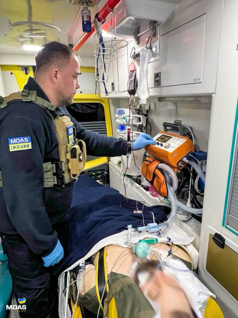Екіпаж МОАС, забезпечуючи увесь необхідний медичний супровід, зокрема штучну вентиляцію легень, гемотрансфузію, мультимодальну аналгезію, необхідну інфузійну терапію та безперервний контроль вітальних функцій, без ускладнень доправив хворого до профільного лікувального закладу, де на нього вже чекали судинні хірурги.