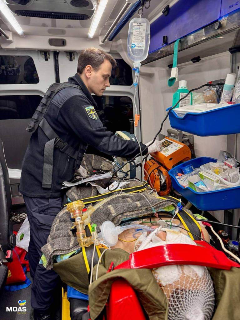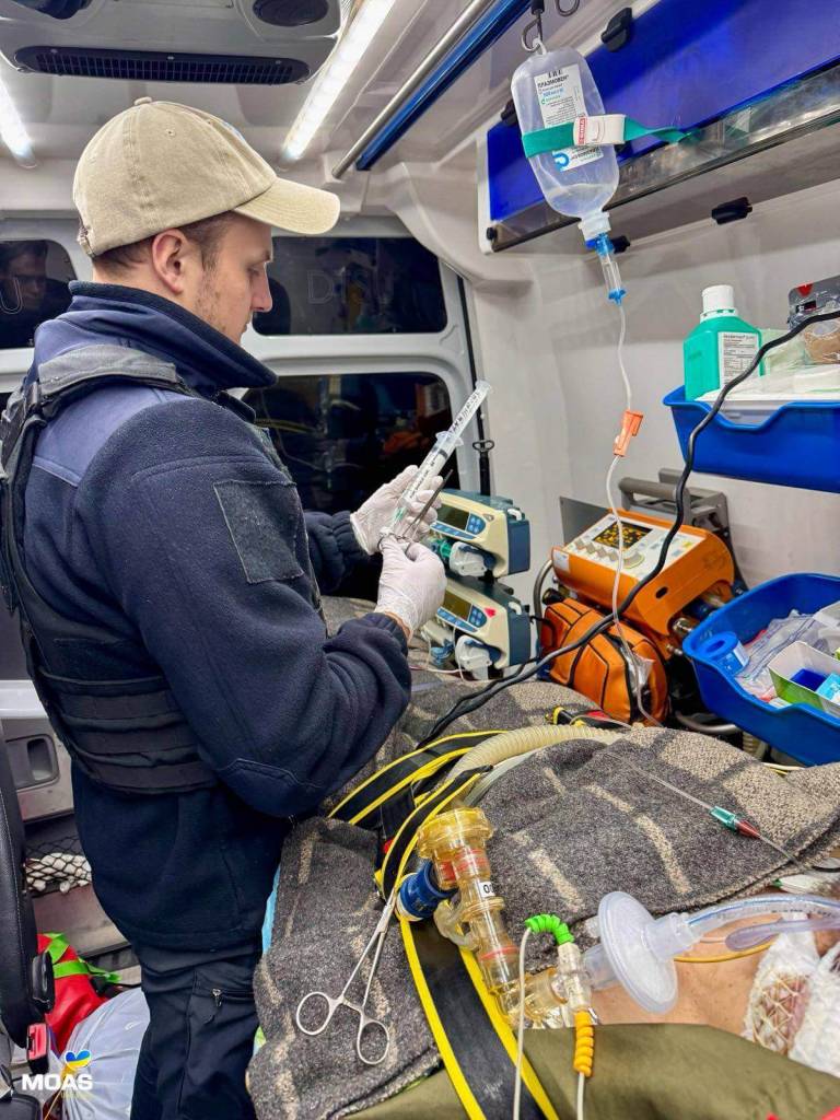 Попри критичні травми, завдяки злагодженим діям медиків постраждалого вдалося підготувати до транспортування, організація якого була покладена на команду МОАС. Наші фахівці, продовжуючи інфузійну терапію, забезпечуючи протективну вентиляцію легень, підтримку седації, адекватного знеболення, міорелаксацію та безперервний моніторинг вітальних показників, без ускладнень доправили чоловіка до тилового шпиталю.
