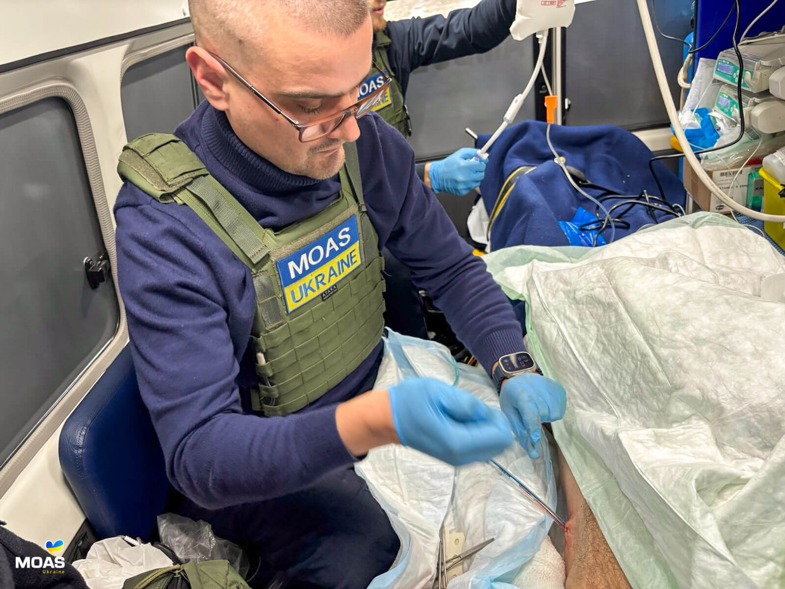 Екіпаж МОАС отримав запит на транспортування важкопораненого захисника. У пацієнта — проникаюча черепно-мозкова травма, множинні вогнепальні поранення тулуба, кінцівок, обличчя та органів зору. Після первинного огляду та стабілізації наша медична бригада